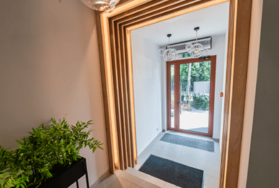 Na działce przewidziano dwa wjazdy – do parkingu podziemnego i garażu naziemnego oraz główne wejście. Nowoczesna architektura oraz staranne wykonanie idealnie wpisują się w charakter warszawskich Bielan, zapewniając mieszkańcom komfortowe i bezpieczne warunki życia.