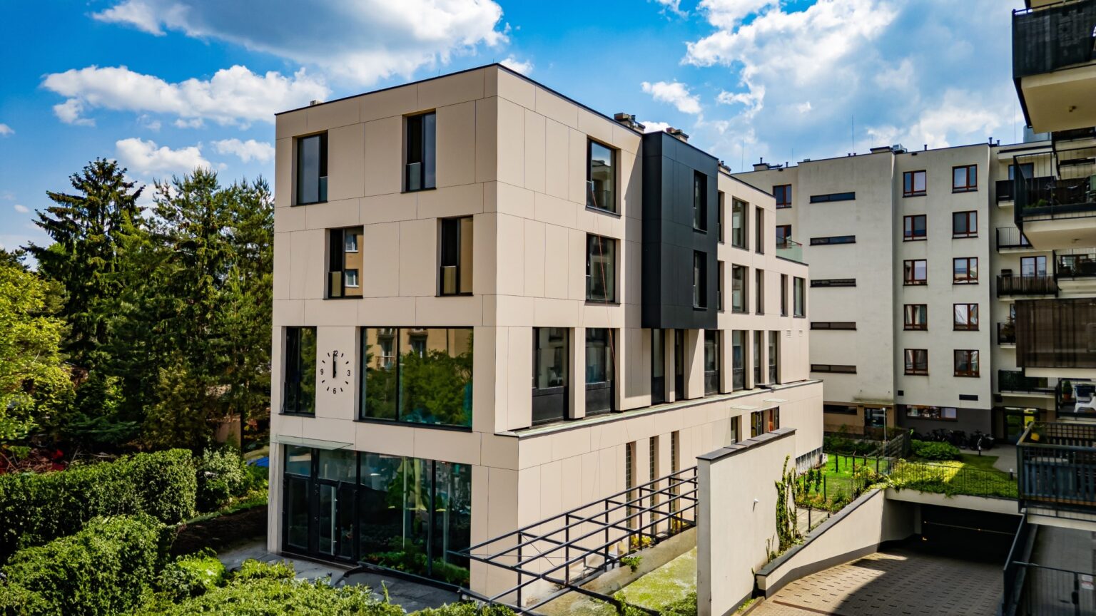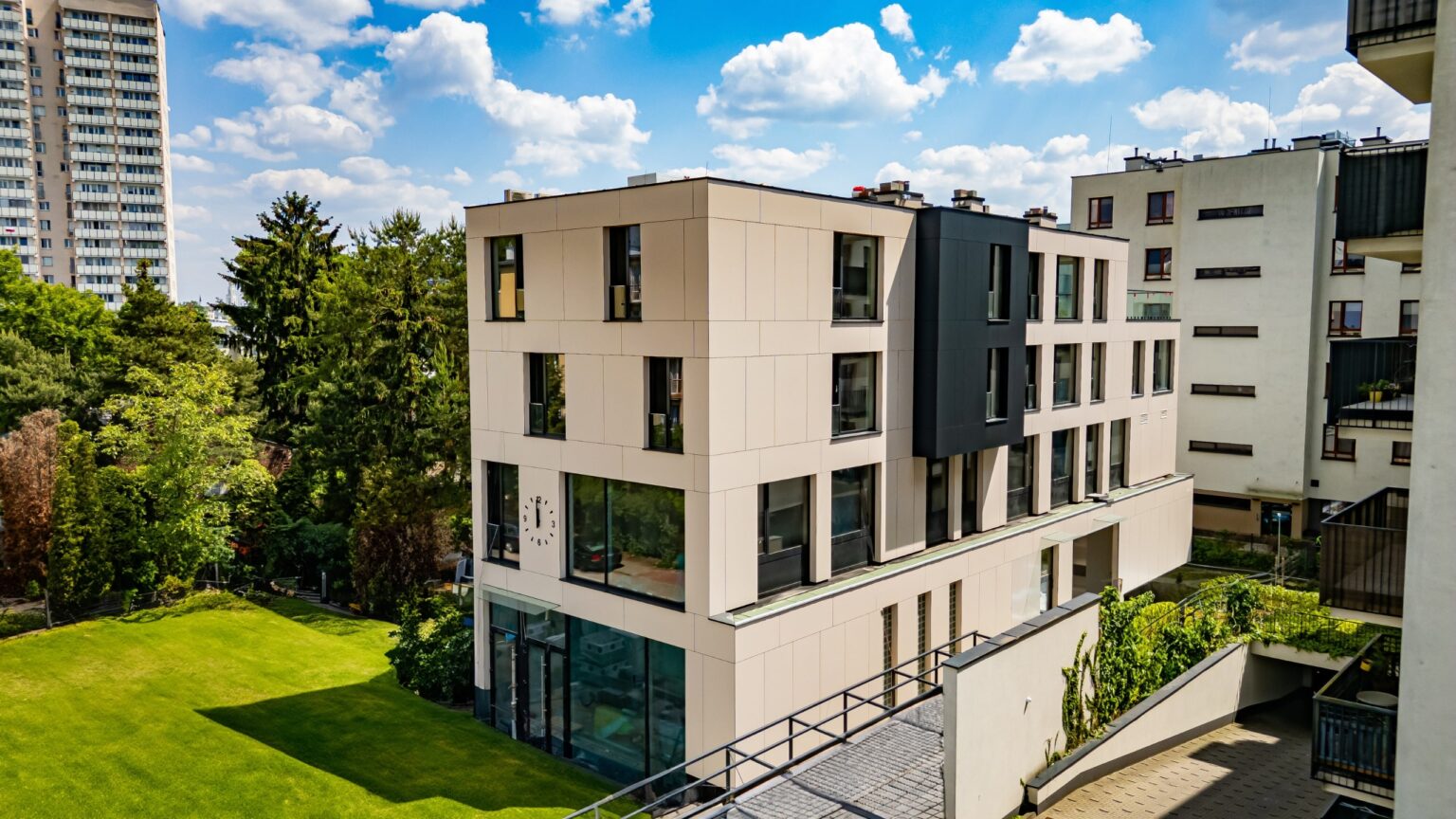 Realizacja budowy nowoczesnego budynku wielorodzinnego z apartamentami w Warszawie. Obiekt wyróżnia się elegancką, minimalistyczną architekturą, dużymi przeszkleniami oraz przestronnymi balkonami. Projekt został wykonany w wysokim standardzie z użyciem nowoczesnych technologii i materiałów, zapewniając mieszkańcom komfort, funkcjonalność i trwałość na lata.