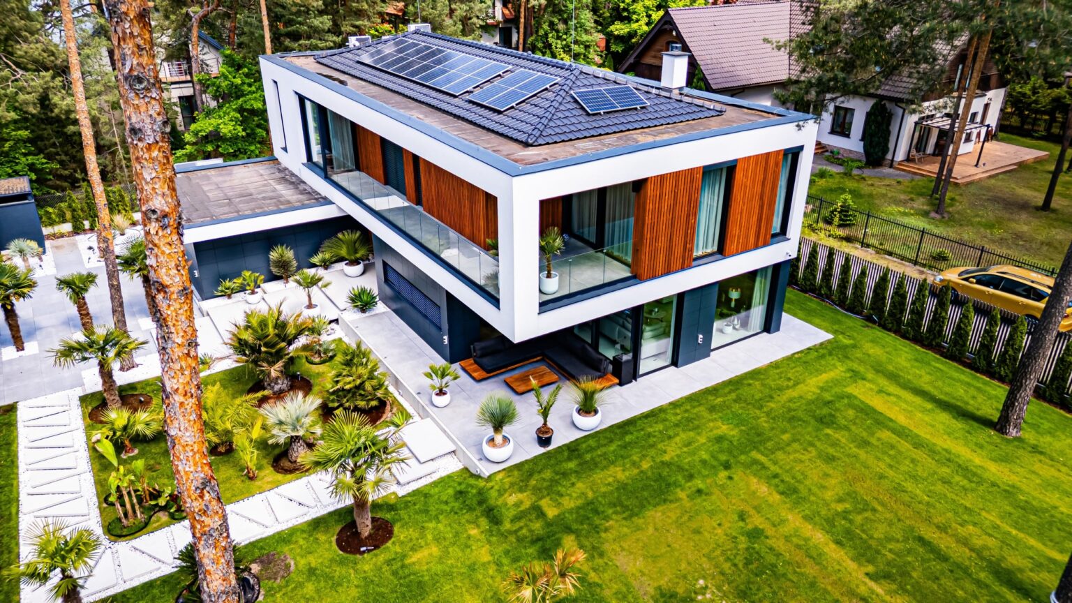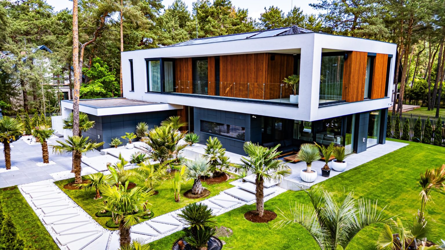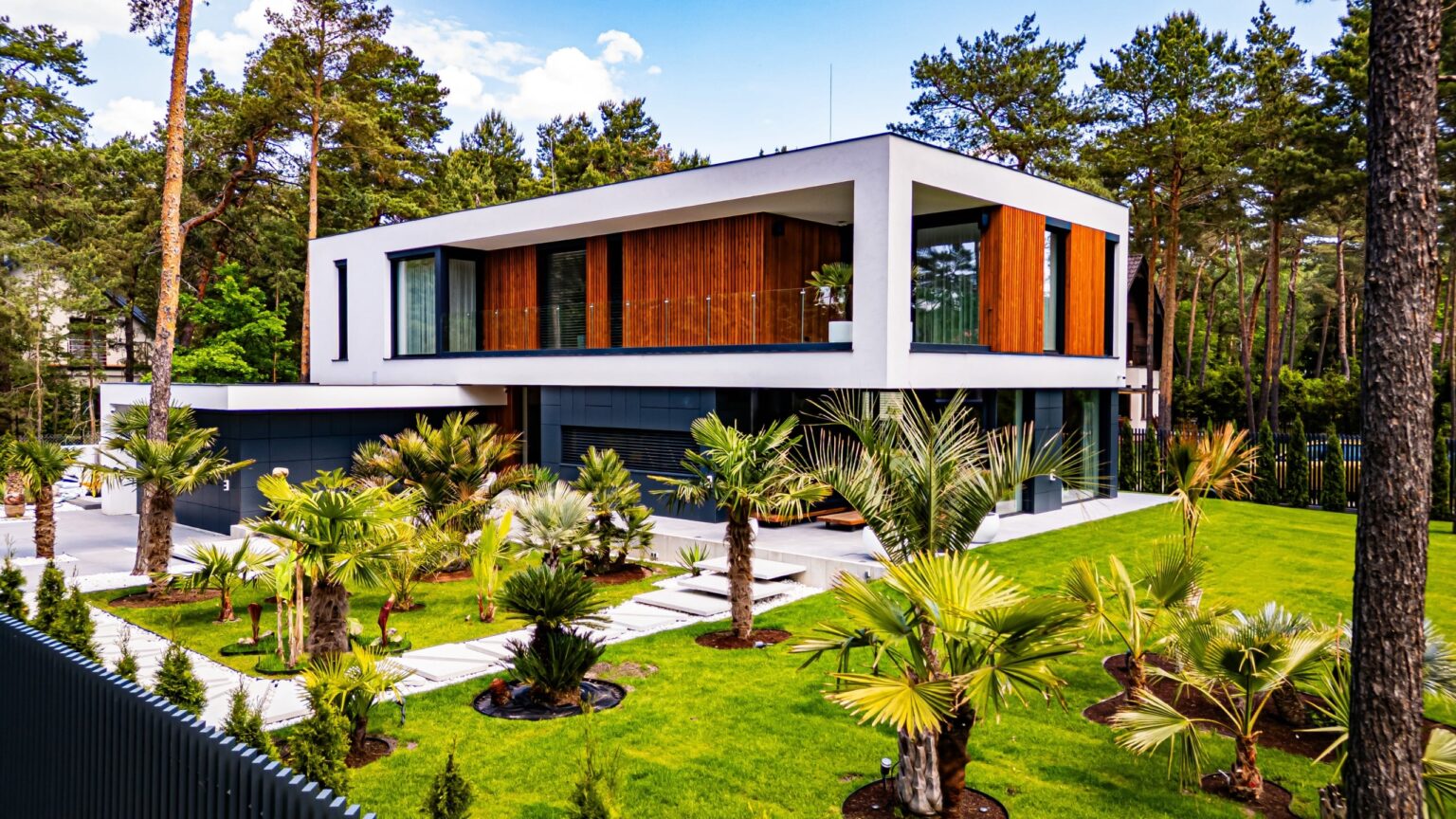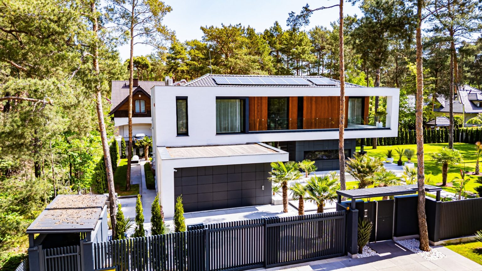 Projekt harmonijnie wpisuje się w otoczenie dzięki swojej skali, formie i kolorystyce, nawiązując do sąsiedniej zabudowy o podobnych gabarytach. Działka o leśnym charakterze, z wysoką zielenią, stanowi idealne tło dla tej nowoczesnej, a zarazem eleganckiej realizacji.