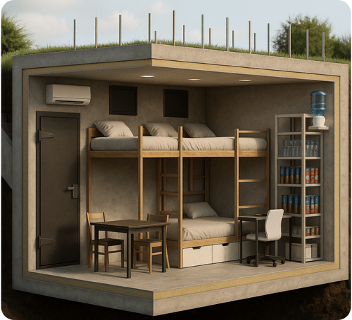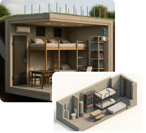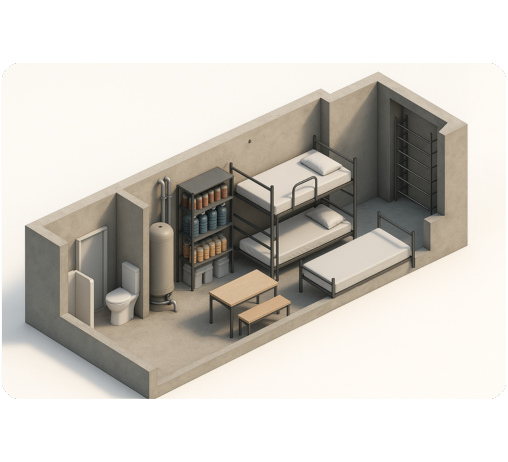 Wielkość oraz układ i aranżację wnętrza schronu domowego można dopasować do indywidualnych potrzeb użytkownika. Budujemy schrony dostosowane do różnej liczby osób. Można w nich składować zapasy żywności i wody. Mają też systemy filtracji powietrza.